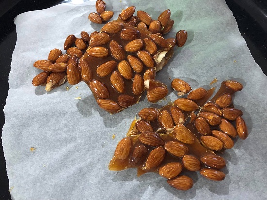 - Kada dobije boju svijetlog karamela dodajte bademe, isključite ringlu i miješajte svo vrijeme dok bademi ne počnu da ispuštaju miris i pokoji počne da pucketa. Dobit ćete boju karamela, sve traje do 2 minuta maximum od momenta kada ste dodali bademe.