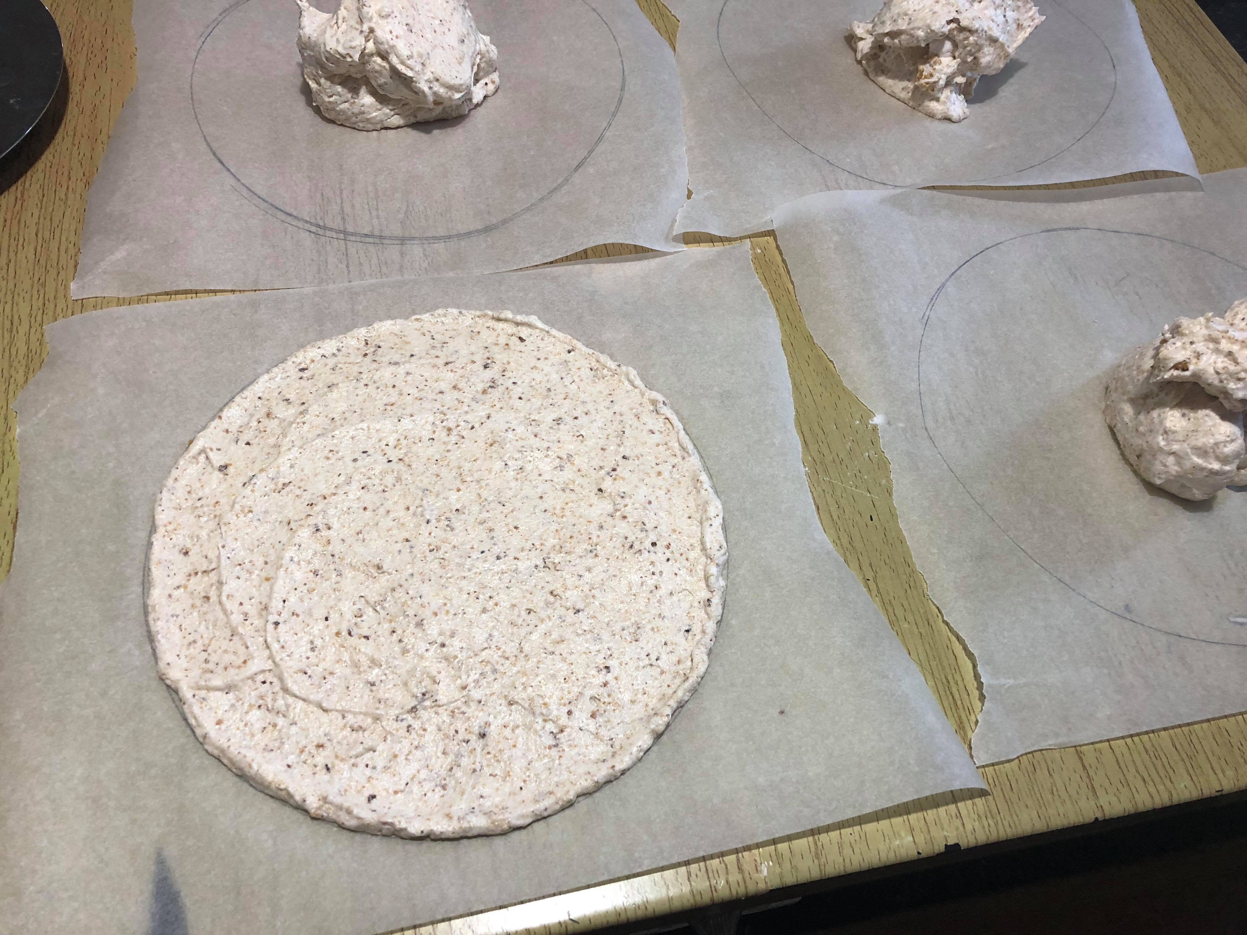 - Smjesu rasporedite što ravnomjernije na svih 8 pripremljenih papira, stavite prvo po 1 veliku kašiku na svaki papir pa dodajite od smjese dok ne potrošite i vidite da su svi otprilike isti. Pažljivo razmažite smjesu u okviru kruga, poravnajte .
