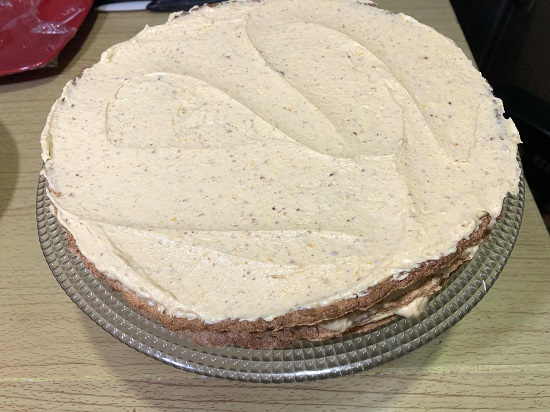 - Na tacnu za serviranje na par mjesta stavite malo kreme, ovo će služiti da se prva korica zalijepi da se ne bi pomijeralo dok razmazujete ostale. Na tacnu stavite prvu koru sa papirom okrenutim na gore, skinite papir, namažite sloj kreme, stavite drugu koru i ponavljajte postupak dok ne potrošite sve korice. Vodite računa da vam ostane kreme da premažete tortu i sa strana.