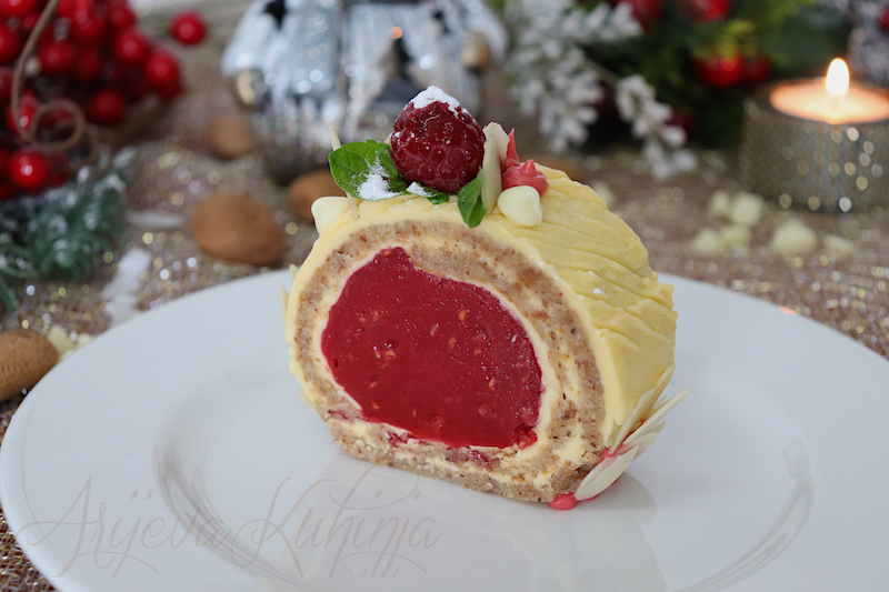 Ja sam ga danas pravila u obliku rolata pa je zahtijevao malo više truda, vidjet ćete sve u videu koji sam veoma detaljno snimila 🙂 Ako pravite kao šnite za tren je gotovo. Ukoliko se odlučite za šnite nakon što ispečete koru i nakon što odstoji poklopljena, isiječete je na 3 jednake lente zajedno sa papirom, premazujete jednu lentu bijelim filom, preko ohlađeni fil od malina, pa prinesete drugu lentu sa papirom na gore, skinete papir premažete je bijelim filom pa preko filom od malina i tako dok ne potrošite sastojke. Ostavite u frižider na sat vremena da se malo stisne i spremna je za konzumaciju 🙂